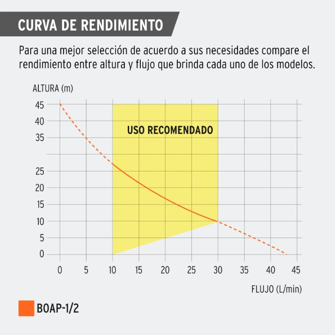 Para un uso optimo de rendimiento de laa Bomba Periferica BOAP-1/2, es recomendable utilizar sobre la curva que se muestra en la grafica.
